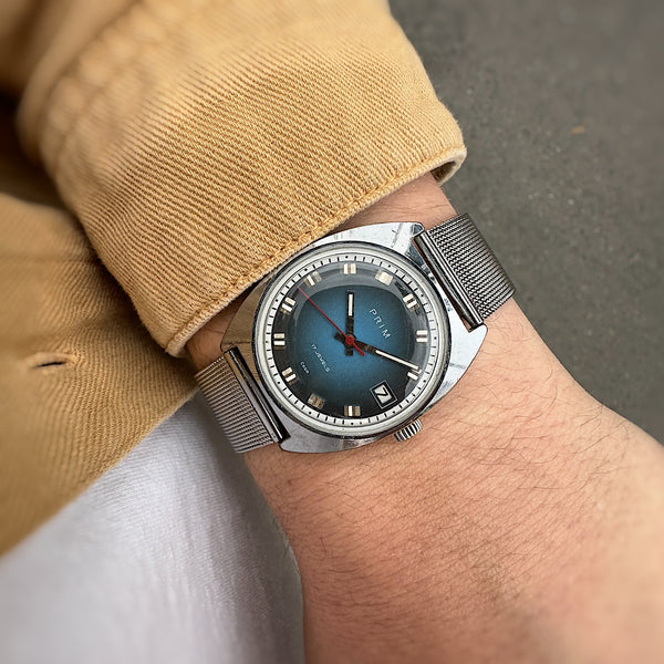 jmenujeme se Prim Inkoust a byly jsme vyrobeny v roce 1976. Jméno je odvozeno od naeho inkoustově modrého ciferníku, který přechází ze světlě modré ve středu až po téměř černou ve stranách ciferníku. Naši devízou je kombinace elegantního a sportovního stylu, takže se výborně hodíme na všechny události. Pouzdro je chromované a má v průměru 37 mm, což z nás činí poměrně robustní hodinky. Pohání nás strojek typu 68.4 s manuálním nátahem.