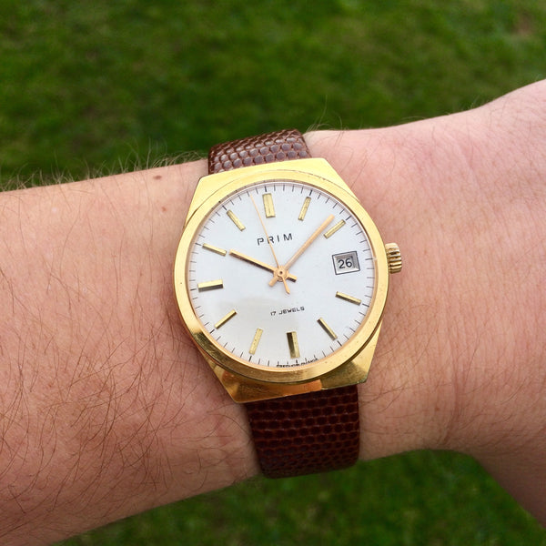 jsme Prim Index a byli jsme vyrobeny v roce 1974. Naše jméno odpovídá jednoduchost4 našich indexů, které jsou plastické a fantasticky oživují ciferník. Zlacené pouzdro měří 34 x 37 mm, takže se hodíme na všechna zápěstí. Náš motor je krásný stroj 68.4.