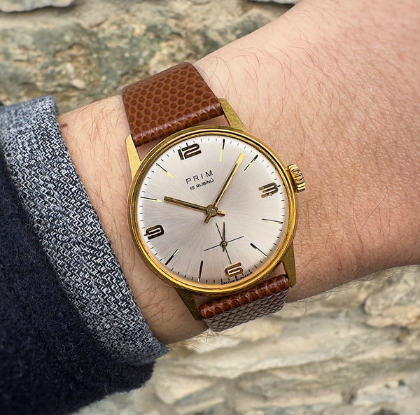 jmenujeme se Prim Záře, jelikož budeme na Tvém zápěstí nepřehlédnutelné. Byly jsme vyrobeny v roce 1971, kdy jsme byly jako jedny z posledních osazeny strojkem 50.1. Naše zlacené pouzdro, o průměru 32 mm, vypadá skvěle na dámském i pánském zápěstí.